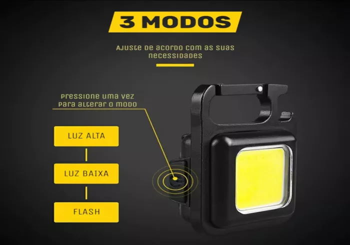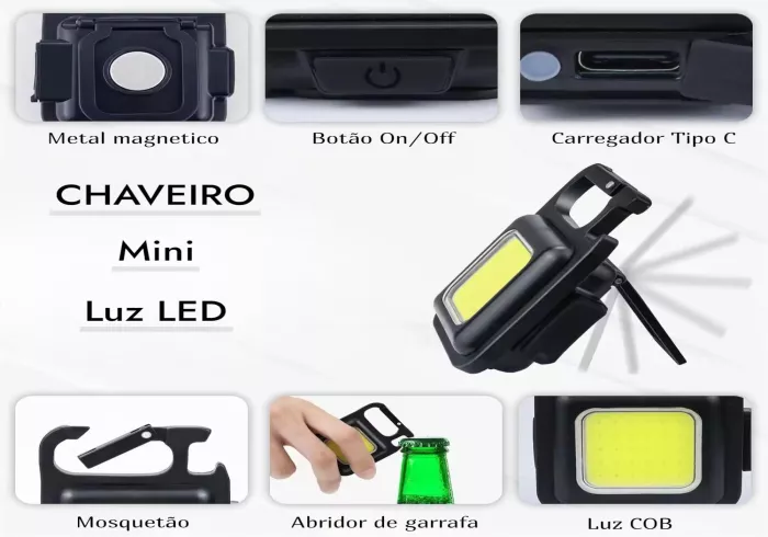 Apresentamos a mini lanterna LED portátil multifuncional, perfeita para suas aventuras ao ar livre e situações do dia a dia. Com dimensões compactas de 6 x 4,2 x 2,4 cm, esta lanterna versátil oferece 3 modos de iluminação diferentes para atender todas as suas necessidades. O alcance impressionante de até 300 metros garante visibilidade excepcional em ambientes escuros. Fabricada em liga de alumínio resistente, a lanterna inclui um prático mosquetão para fixação em mochilas, bolsas ou chaveiros, além de um conveniente abridor de garrafas integrado. Recarregável via USB, elimina a necessidade de pilhas descartáveis. A lanterna é resistente a respingos d'água, ideal para uso em diversas condições. O design compacto e leve torna-a perfeita para camping, trilhas noturnas ou como equipamento de emergência. Com sua construção durável e funcionalidades múltiplas, esta lanterna é uma ferramenta indispensável para aventureiros e uso cotidiano.